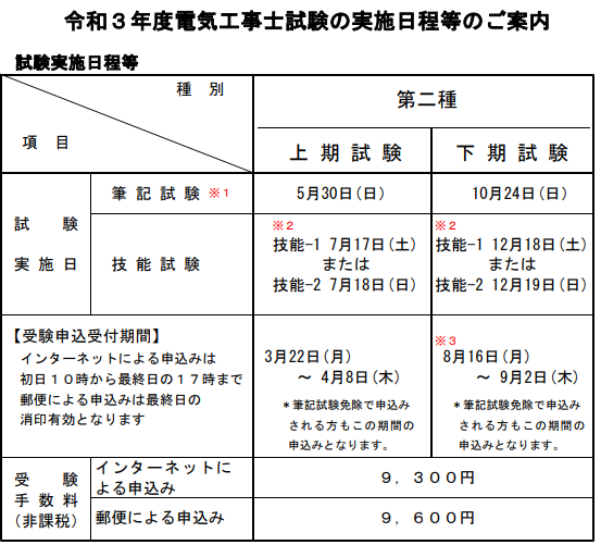筆記試験と技能試験があります。下記は令和三年の試験日程などです。